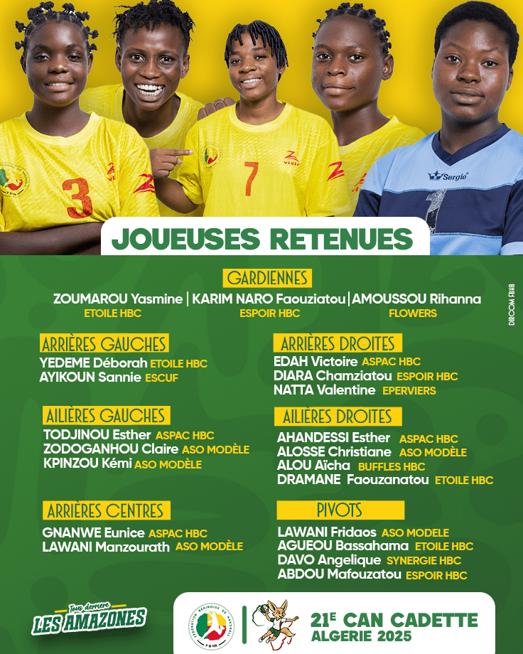 Parmi elles, plusieurs visages sont déjà familiers du public béninois : Zoumarou Yasmine (Etoile), Karim Naro Faouziatou (Espoir), Edah Victoire (ASPAC) ou encore les sœurs Lawani, Fridaos et Manzourath (Aso Modèle). Certaines ont déjà représenté le pays lors de compétitions internationales comme les Gymnasiades de Bahreïn en 2024, le Challenge Trophy de l’IHF à Abidjan 2025 (médaille de bronze) et la première édition des Jeux Scolaires Africains en Algérie.