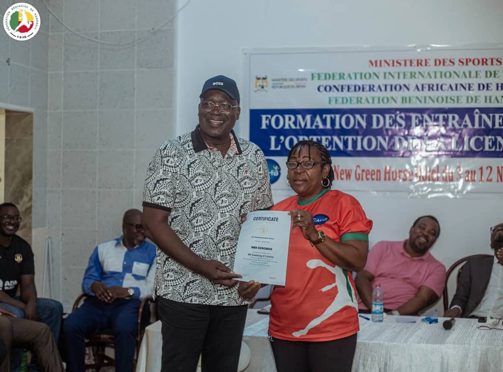 Après dix jours de travaux intenses alliant théorie et pratique, la formation des entraîneurs pour l’obtention de la Licence C IHF a trouvé son aboutissement ce mardi 11 novembre 2025 à Cotonou. C’est lors d’une cérémonie solennelle que quarante stagiaires, venus de six pays africains, ont reçu leurs précieux parchemins, marquant leur certification officielle. L’événement, empreint d’une solennité sportive, a été honoré par la présence des représentants du Ministère béninois des Sports, de la Confédération Africaine de Handball (CAHB) et de la Fédération béninoise de handball, illustrant l’importance stratégique de cette initiative pour le développement du handball sur le continent.